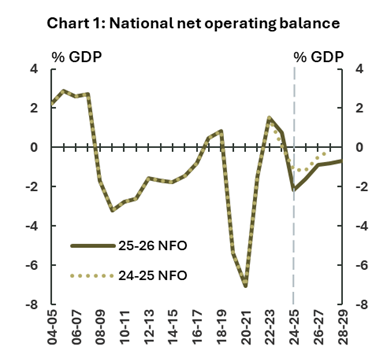 Compared to last year’s forecast of a rapid return to a national net operating surplus, the latest budget forecasts result in continued deficits over the forward estimates.