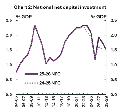 National net capital investment is forecast to rise from 1.2% of GDP ($34.1 billion) in 2025‑26 to 1.5% of GDP ($50.5 billion) in 2028‑29. Compared to our previous NFO, forecast national net capital investment has increased – revised up by $3.9 billion in 2024‑25 and $7.6 billion in 2027‑28. |