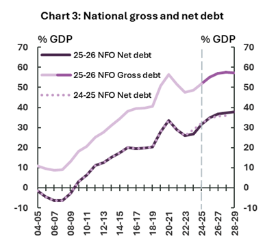 Forecast national net debt[3] has worsened compared to the 2024‑25 NFO. It remains on a slight upwards trajectory but is forecast to moderate by 2027‑28, reaching 37.9% of GDP by 2028‑29 (Chart 3). Commonwealth net debt is around 61% of the total. National public debt interest payments are forecast to increase markedly from 1.7% of GDP in 2025‑26 to 2.1% of GDP in 2028‑29.