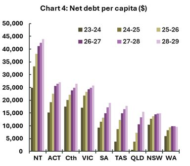 Net debt in most jurisdictions remains at record high levels over the forward estimates. On a per capita basis, NT continues to have the highest net debt, however, along with WA, it is the only jurisdiction to forecast a decline in net debt in 2027‑28 (Chart 4).